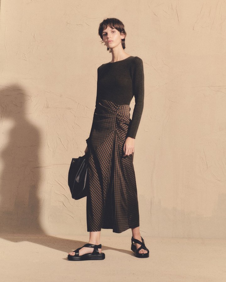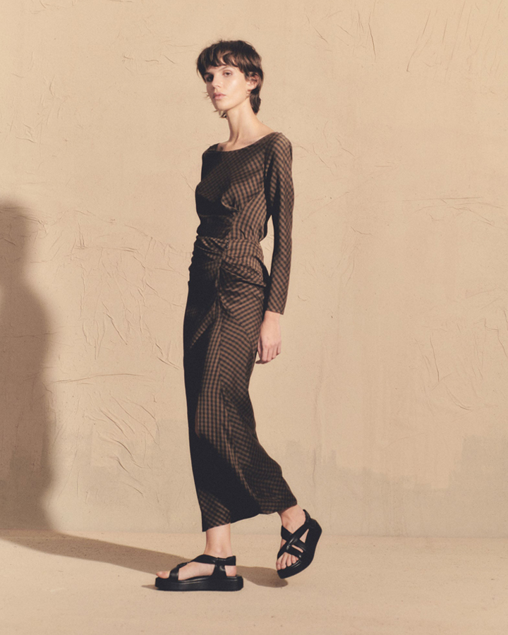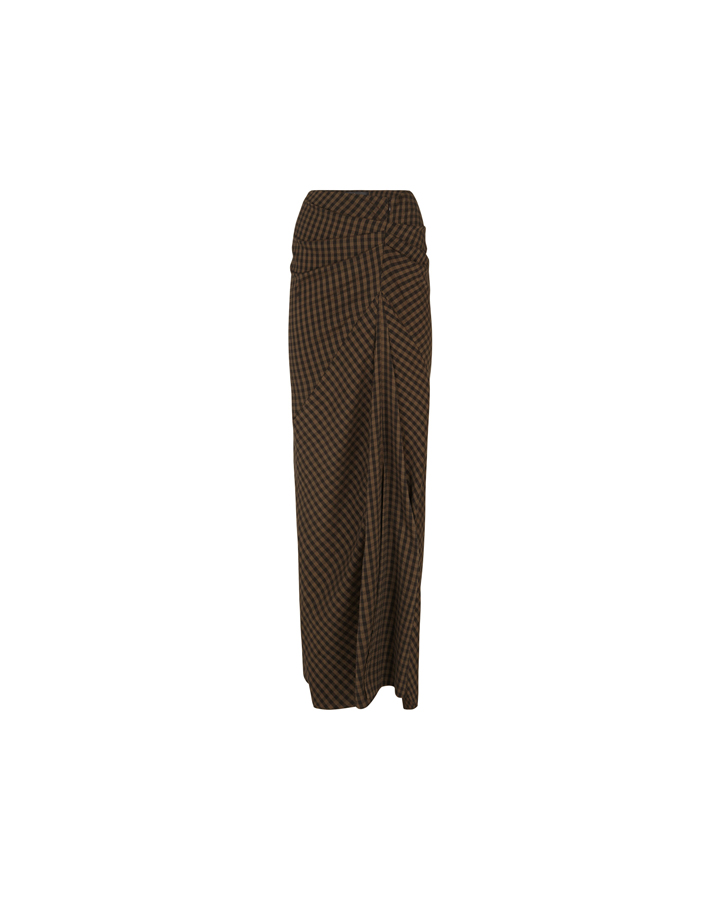 Cortana 黑棕格紋抓褶真絲半裙