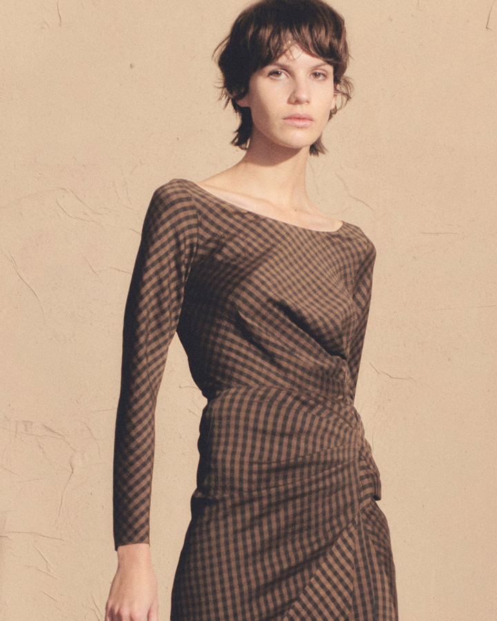 Cortana 黑棕格紋抓褶真絲上衣