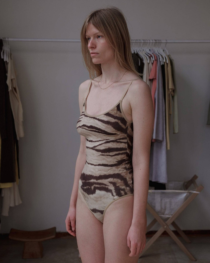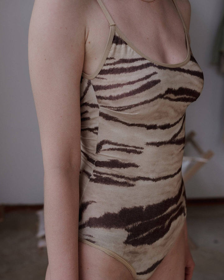 “萊賽爾竹纖維大挖背細肩帶連身裝,可調節式彈性肩帶,襠底有扣子方便穿脫。葡萄牙製造,93%竹纖維,7%彈性纖維,使用FSC森林認證竹纖維。版型適合正常與偏小的胸量。模特穿著S碼。