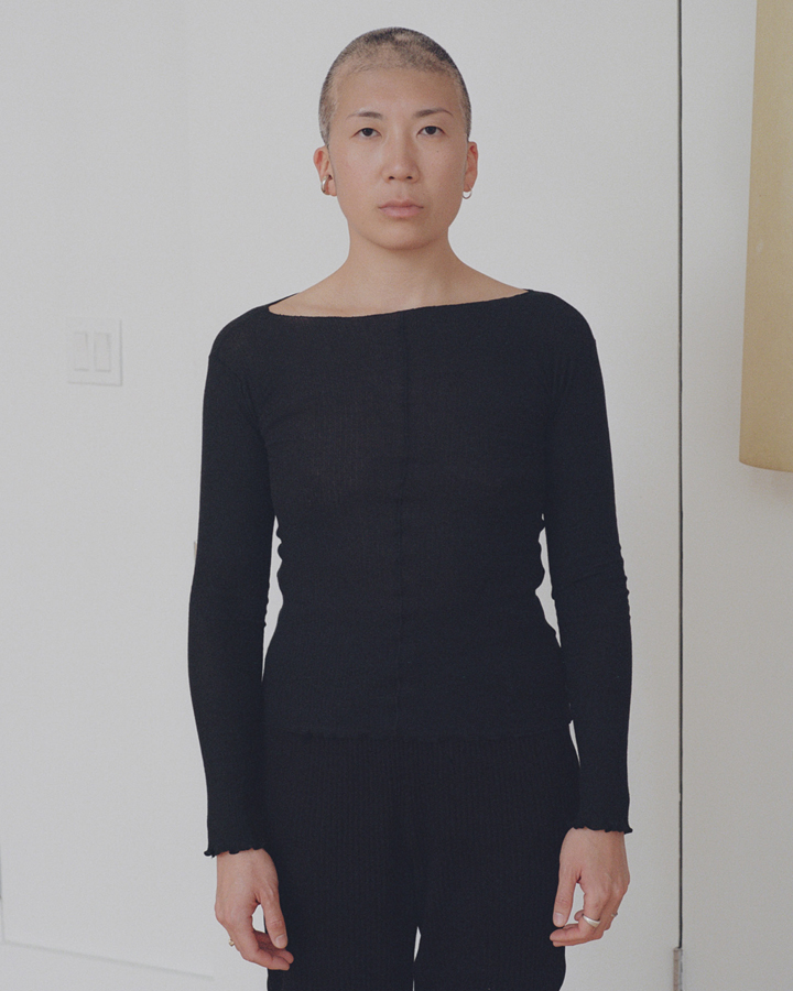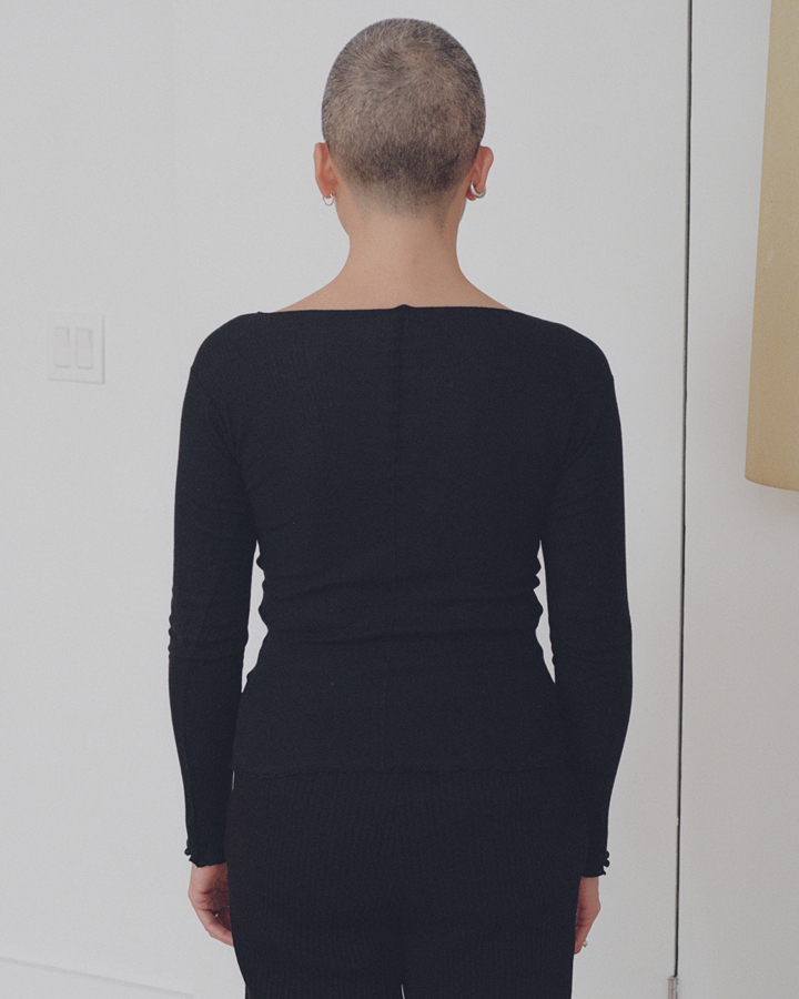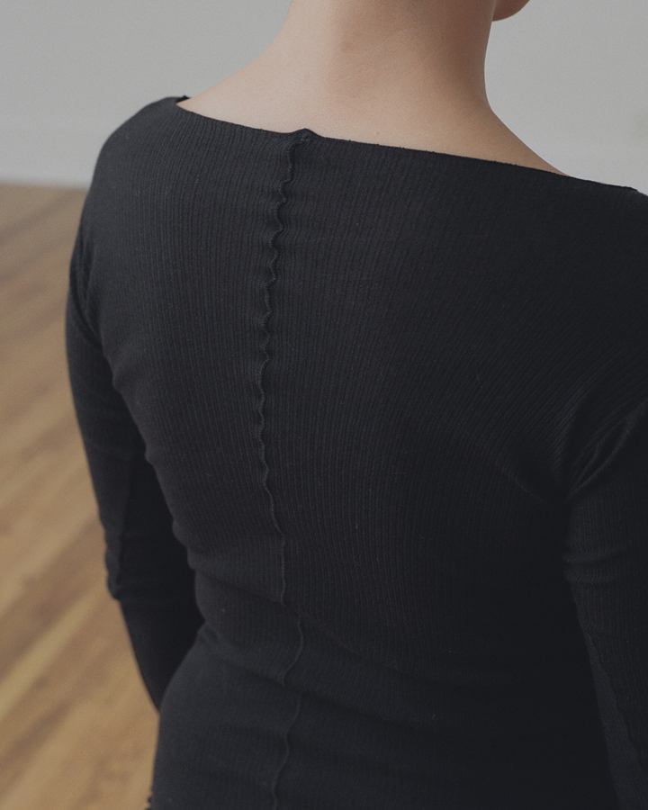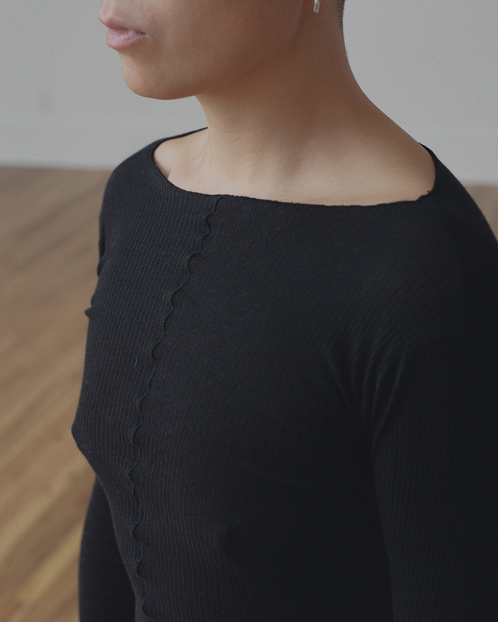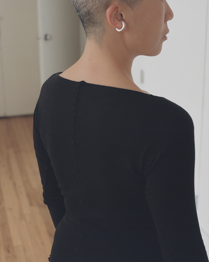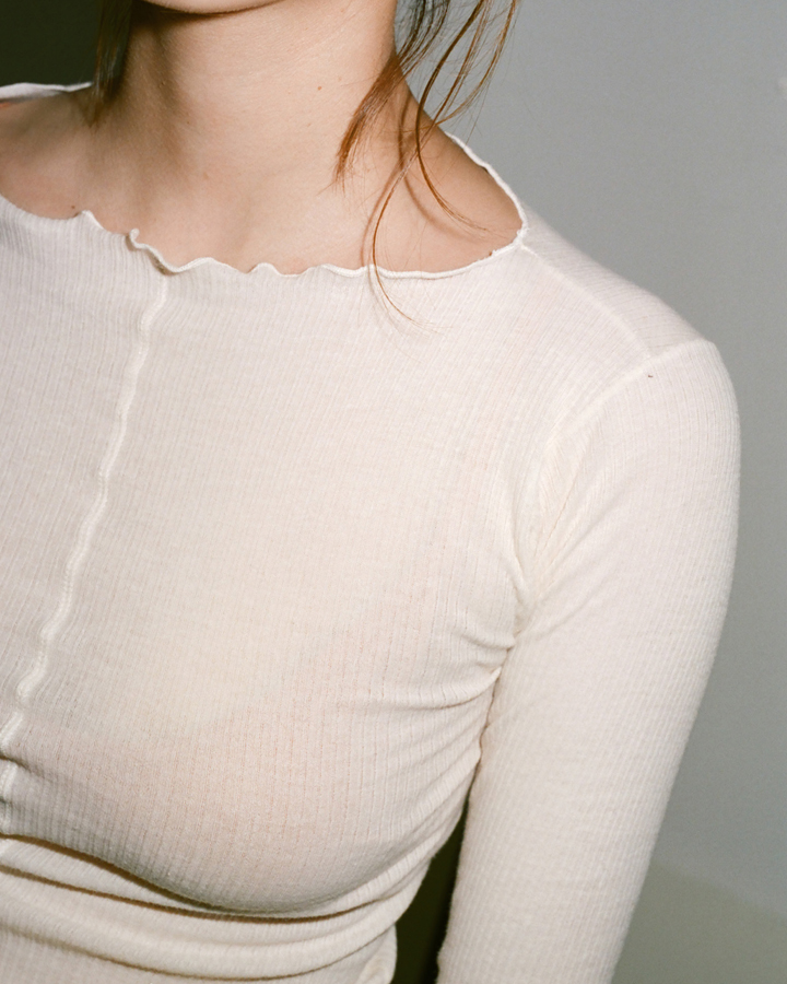 “有機棉高領羅紋長袖上衣,船型領,領口下擺密拷收邊,縫線外露。葡萄牙製造,91%棉,9%彈性纖維,使用來自巴西,印度,埃及的有機棉花,擁有GOTS國際有機棉認證標章。版型偏小,建議選擇較大尺碼。模特穿著S碼。