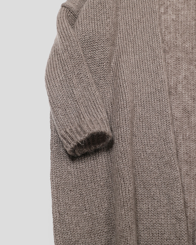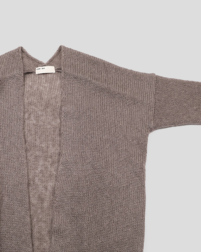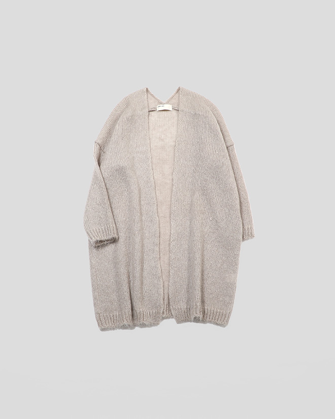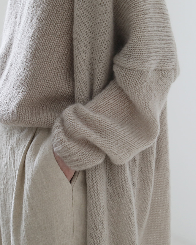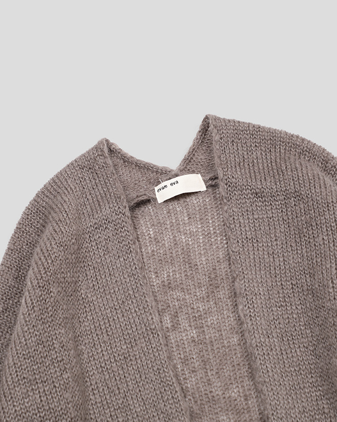 採用馬海毛紗粗織而成,其特點是具有絲綢般的光澤和柔軟性,蓬鬆的絨毛和優雅的光澤為簡單的開襟罩衫增添了魅力。